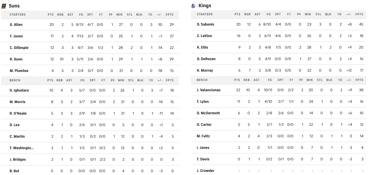 Το Σακραμέντο έκλεισε με νίκη τη regular season, επικρατώντας των Σανς εντός έδρας, με θετικούς τους Βαλαντσιούνας και Σαμπόνις που είχαν από 22 και 20 αντίστοιχα. Πρώτος σκόρερ των φιλοξενουμένων ο Άλεν με 20.