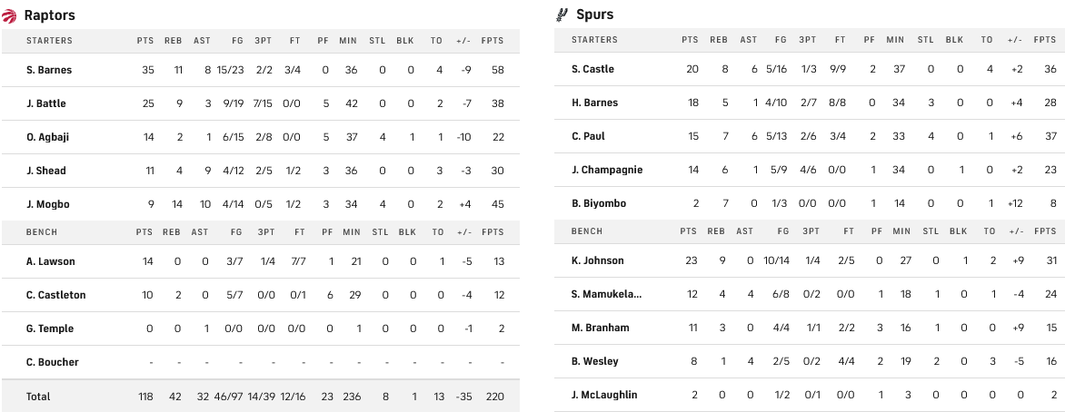 Σπουδαία ανατροπή από το Σαν Αντόνιο κόντρα στο Τορόντο, με τους Τζόνσον και Καστλ να πετυχαίνουν από 23 και 20 πόντους αντίστοιχα για να οδηγήσουν τους γηπεδούχους στη νίκη. Από τους Καναδούς ξεχώρισε ο Μπαρνς με 35.