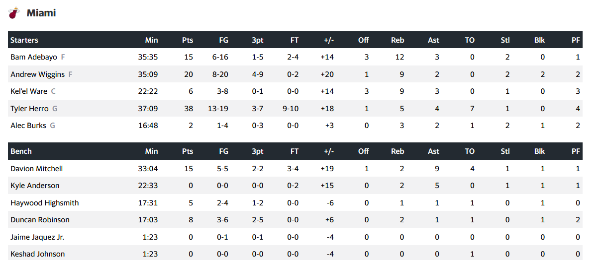Από τους νικητές, πρωταγωνιστής και πρώτος σκόρερ ήταν ο εκπληκτικός Τάιλερ Χίροου με 38 πόντους και 5 ριμπάουντ, ενώ ακολουθεί ο Άντριου Γουίγκινς με 20 πόντους και 9 ριμπάουντ.