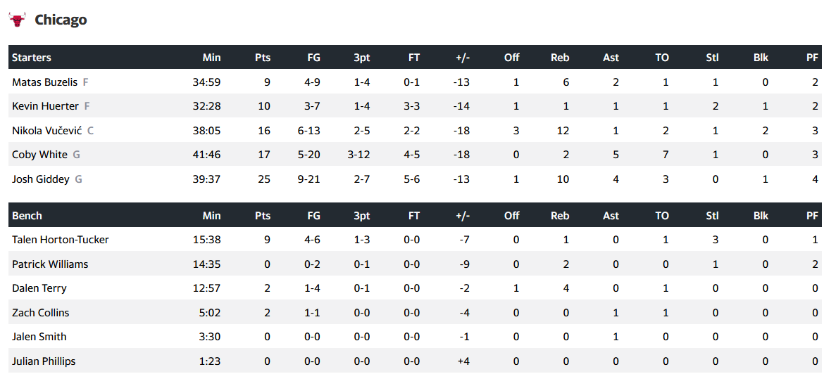 Από την ομάδα του Σικάγο ξεχώρισε ο Τζος Γκίντι με 25 πόντους και 10 ριμπάουντ, καθώς και ο Νίκολα Βούτσεβιτς με 16 πόντους και 12 ριμπάουντ.