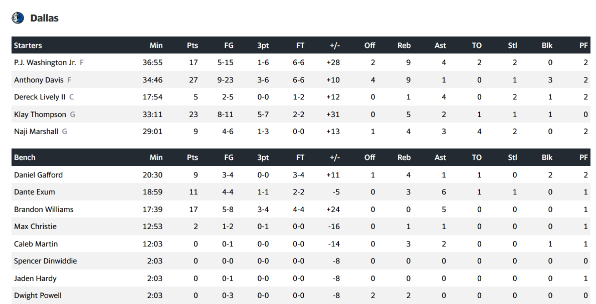 Από την ομάδα του Ντάλας ξεχώρισε ο Άντονι Ντέιβις με 27 πόντους και 9 ριμπάουντ, καθώς και ο Κλέι Τόμπσον με 23 πόντους και 5 ριμπάουντ.