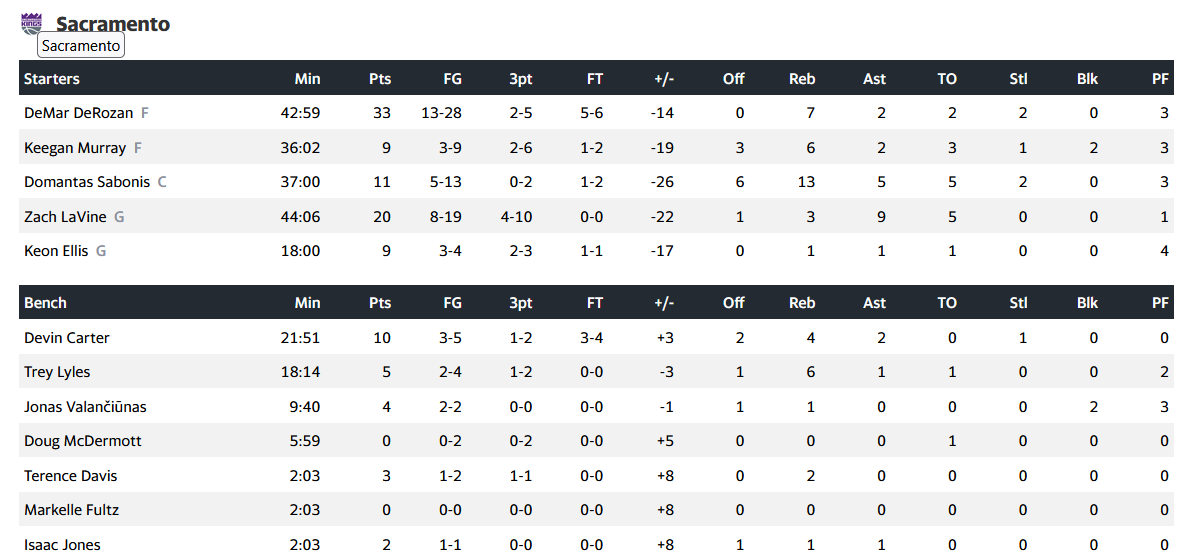 Από το Σακραμέντο, πολύ καλή επίδοση σημείωσε ο ΝτιΜάρ ΝτιΡόζαν με 33 πόντους και 7 ριμπάουντ, ενώ ακολουθεί ο Ζακ ΛαΒίν με 20 πόντους και 9 ασίστ.