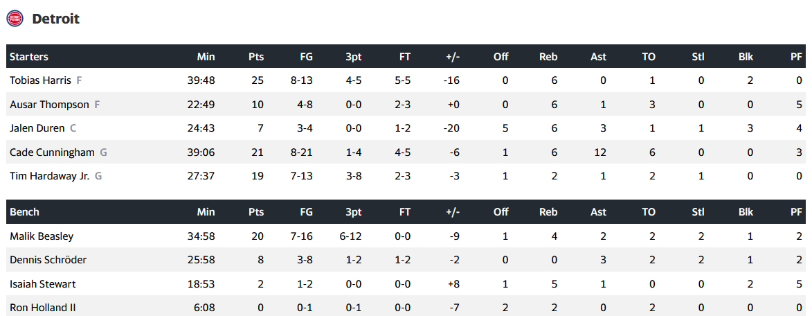 Από το Ντιτρόιτ ξεχώρισε ο Τιμπάιας Χάρις με 25 πόντους και 6 ριμπάουντ, καθώς και ο Κέιντ Κούνινχαμ με 21 πόντους, 6 ριμπάουντ και 12 ασίστ.