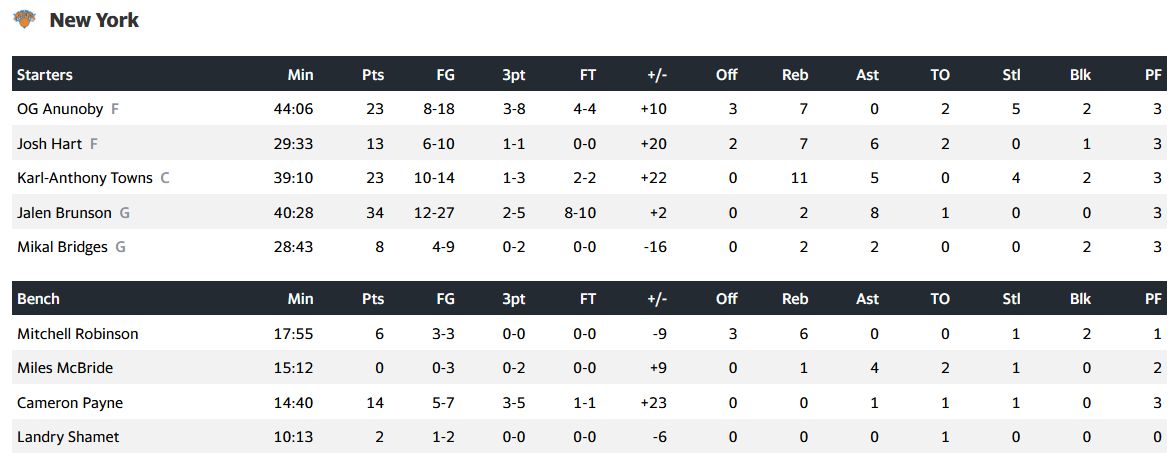 Από τους νικητές, πρωταγωνιστής και πρώτος σκόρερ ήταν ο Τζέιλε Μπράνσον με 34 πόντους και 8 ασίστ, ενώ ακολουθεί ο Καρλ-Άντονι Τάουνς με 23 πόντους, 11 ριμπάουντ και 5 ασίστ.