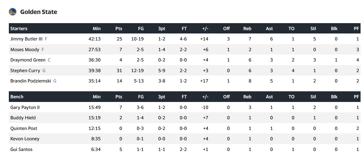Από τους Πολεμιστές, πρωταγωνιστής και πρώτος σκόρερ ήταν ο Στέφεν Κάρι με 31 πόντους και 6 ριμπάουντ και ακολουθεί ο Τζίμι Μπάτλερ με 25 πόντους, 7 ριμπάουντ και 6 ασίστ.