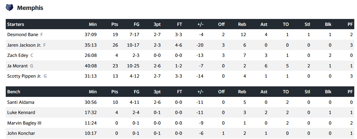Από το Μέμφις ξεχώρισε ο Τζάρεν Τσάκσον Τζούνιορ με 26 πόντους και 6 ριμπάουντ, καθώς και ο Τζα Μόραντ με 23 πόντους και 6 ασίστ.