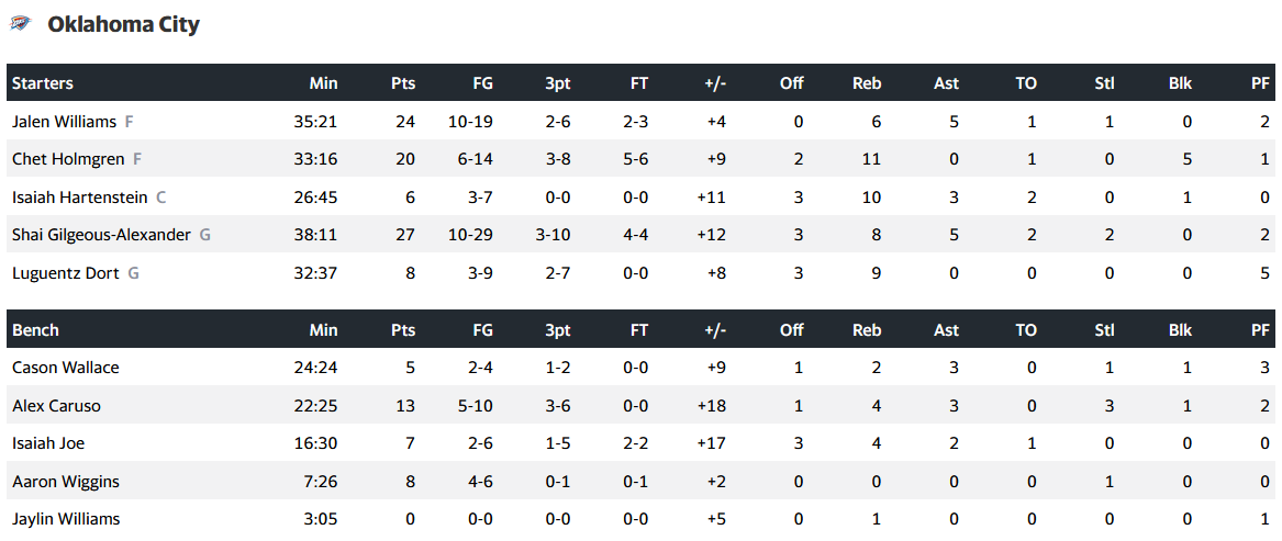 Από την Οκλαχόμα, πολύ καλή επίδοση σημείωσε για ακόμα μία φορά ο Σάι Γκίλτζεους Αλεξάντερ με 27 πόντους και 8 ριμπάουντ, ενώ ακολουθεί ο Τζέιλεν Γουίλιαμς με 24 πόντους, 6 ριμπάουντ και 5 ασίστ.