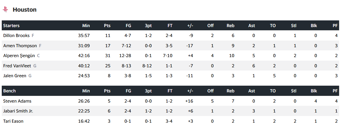 Από την ομάδα του Χιούστον ξεχώρισε ο Άλπερεν Σένγκουιν με 31 πόντους, 10 ριμπάουντ και 5 ασίστ, καθώς και ο Φρεντ ΒανΒλίτ με 25 πόντους και 6 ασίστ.