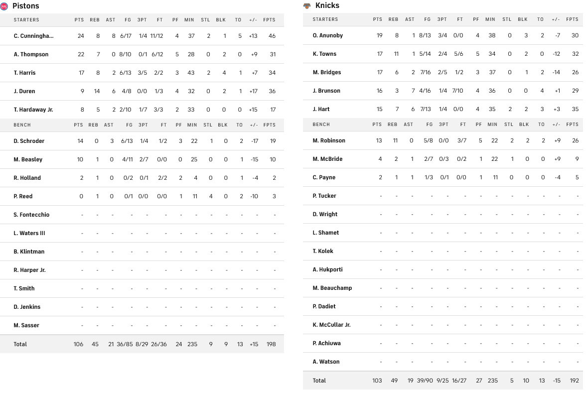 Για τους Νικς, ο Ανουνόμπι σημείωσε 19 πόντους, ο Μπρίτζες 17, όσους και ο Τάουνς, που είχε και 11 ριμπάουντ, ενώ ο Μπράνσον έμεινε στους 16 πόντους.
