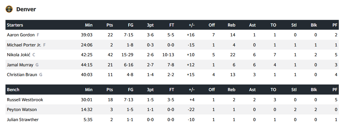 Από τους νικητές, πρωταγωνιστές ήταν ο Νίκολα Γιόκιτς με 42 πόντους, 22 ριμπάουντ και 6 ασίστ, καθώς και ο Άτον Γκόρντον με 22 πόντους και 14 ριμπάουντ.