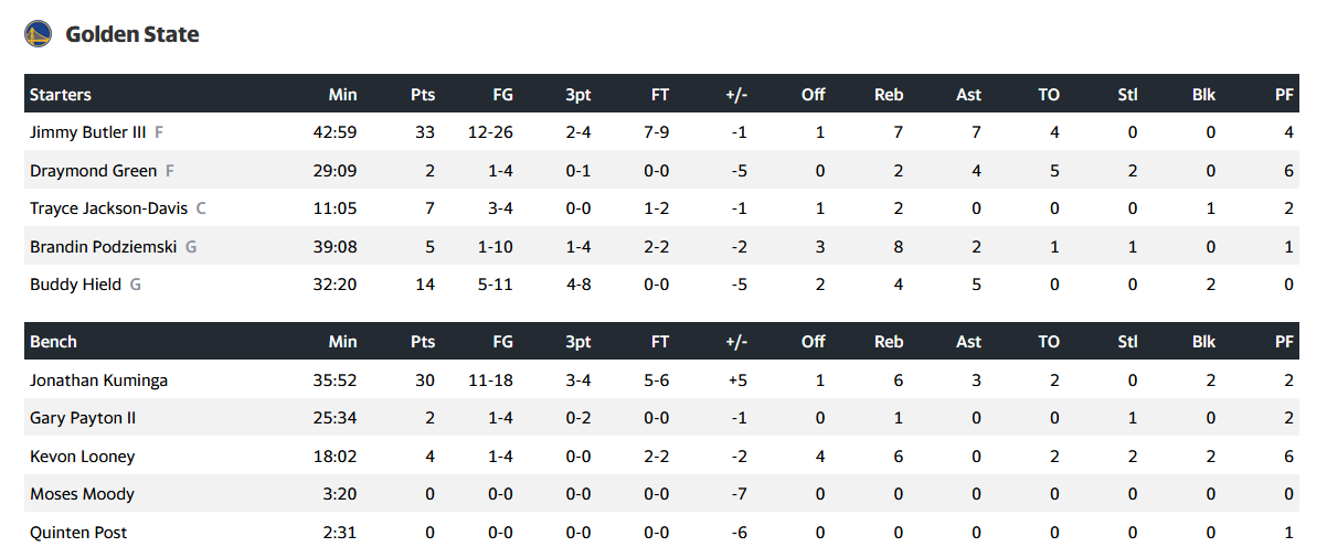 Από την άλλη, από τους Γουόριορς, πολύ καλή εμφάνιση σημείωσε ο Τζίμι Μπάτλερ 33 πόντους και από 7 ασίστ και ριμπάουντ και ακολουθεί ο Τζόναθαν Κουμίνγκα με 30 πόντους και 6 ριμπάουντ.