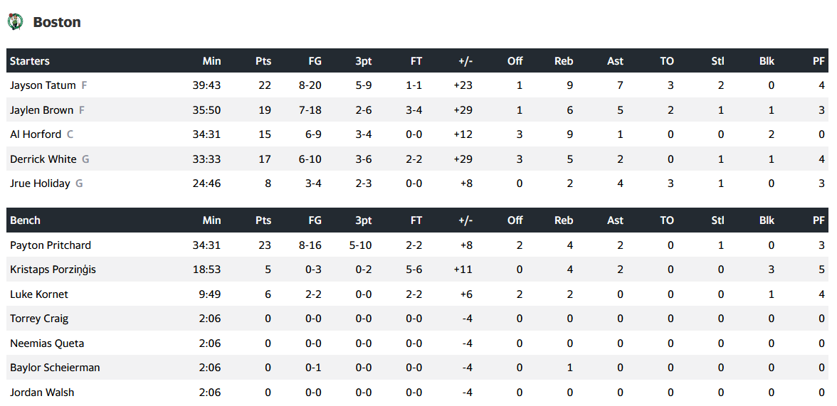 Από τους νικητές ξεχώρισε ο Τζέισον Τέιτουμ με 22 πόντους, 9 ριμπάουντ και 7 ασίστ, καθώς και ο Πέιτον Πρίτσαρντ με 23 πόντους και 4 ριμπάουντ.
