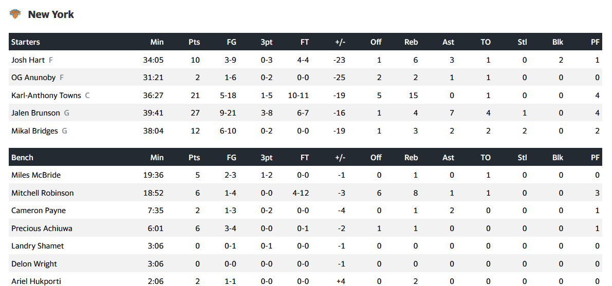 Από την άλλη, από την ομάδα της Νέας Υόρκης, πολύ καλή εμφάνιση σημείωσε ο Τζέιλεν Μπράνσον με 27 πόντους και 7 ασίστ και ο Καρλ-Άντονι Τάουνς με 21 πόντους και 15 ριμπάουντ.