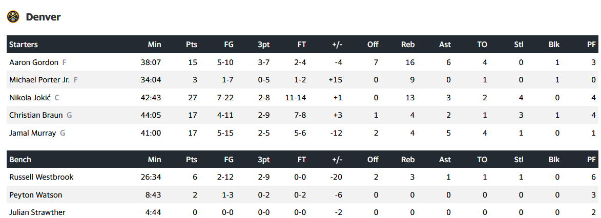 Από την άλλη, από την ομάδα του Ντένβερ ξεχώρισε ο Νίκολα Γιόκιτς με 27 πόντους και 13 ριμπάουντ, ενώ ακολουθεί ο Άρον Γκόρντον με 15 πόντους, 16 ριμπάουντ και 6 ασίστ.