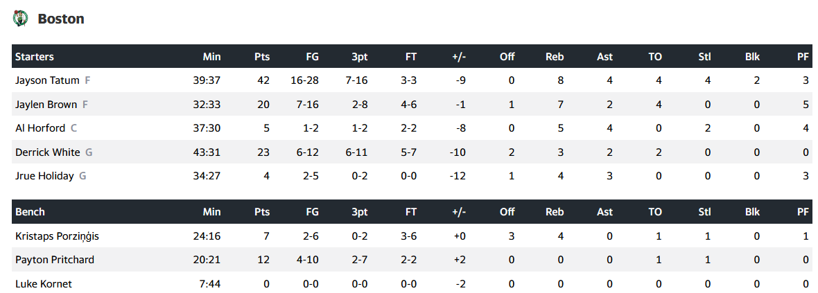 Από την ομάδα της Βοστώνης ξεχώρισε ο Τζέισον Τέιτουμ με 42 πόντους και 8 ριμπάουντ, καθώς και ο Ντέρικ Γουάιτ με 23 πόντους.