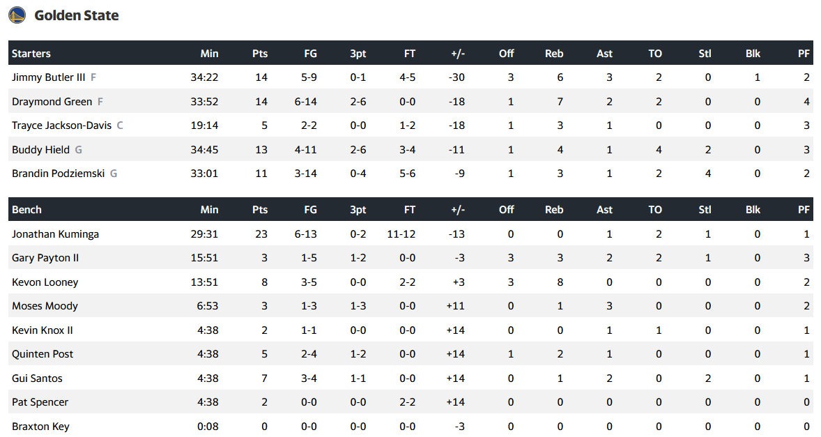 Από τους Πολεμιστές, ξεχώρισε ο Τζόναθαν Κουμίνγκα με 23 πόντους και ο Τζίμι Μπάτλερ με 14 πόντους και 6 ριμπάουντ.
