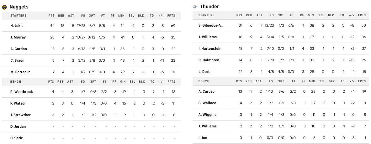 Κορυφαίος για τους νικητές ήταν ο Σέι Γκίλτζεους-Αλεξάντερ, που τελείωσε τον αγώνα με 31 πόντους, 7 ασίστ και 6 ριμπάουντ, με πολύτιμους συμπαραστάτες του τους Τζέιλεν Γουίλιαμς (18π, 9ρ, 4ασ) και Αϊζάια Χάρτενσταιν (15π, 7ρ, 2ασ). Από πλευράς φιλοξενούμενων, σπουδαία εμφάνιση πραγματοποίησε ο Νίκολα Γιόκιτς με 44 πόντους, 15 ριμπάουντ και 5 ασίστ, πλην όμως του Τζαμάλ Μάρεϊ (28π, 4ρ, 3ασ) δεν υπήρχε άλλος «βοηθός»