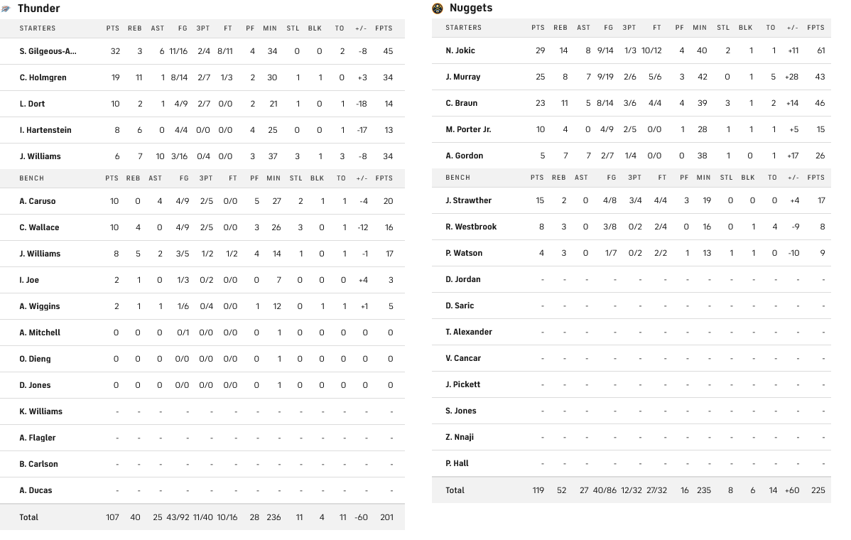 Για τους Θάντερ, ο Γκίλτζιους Αλεξάντερ είχε 32 πόντους, με τον Χόλμγκρεν να προσθέτει 19 πόντους και 11 ριμπάουντ. Όσον αφορά τον Τζέιλεν Γουίλιαμς, είχε μόλις έξι πόντους, με 3/16 σουτ, αν και κατέβασε επτά ριμπάουντ και μοίρασε 10 ασίστ.