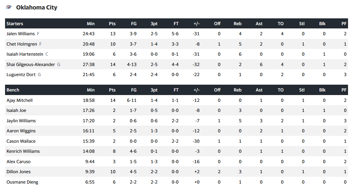 Από τους Κεραυνούς ξεχώρισε ο Σάι Γκίλτζεους Αλεξάντερ με 14 πόντους και 6 ασίστ και ο Τζέιλεν Γουίλιαμς με 13 πόντους και 4 ριμπάουντ.