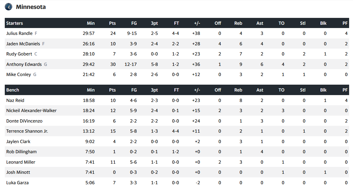 Από τους νικητές, πρωταγωνιστής ήταν ο Άντονι Έντουαρντς με 30 πόντους, 9 ριμπάουντ και 6 ασίστ, ενώ ακολουθεί ο Τζούλιους Ραντλ με 24 πόντους.