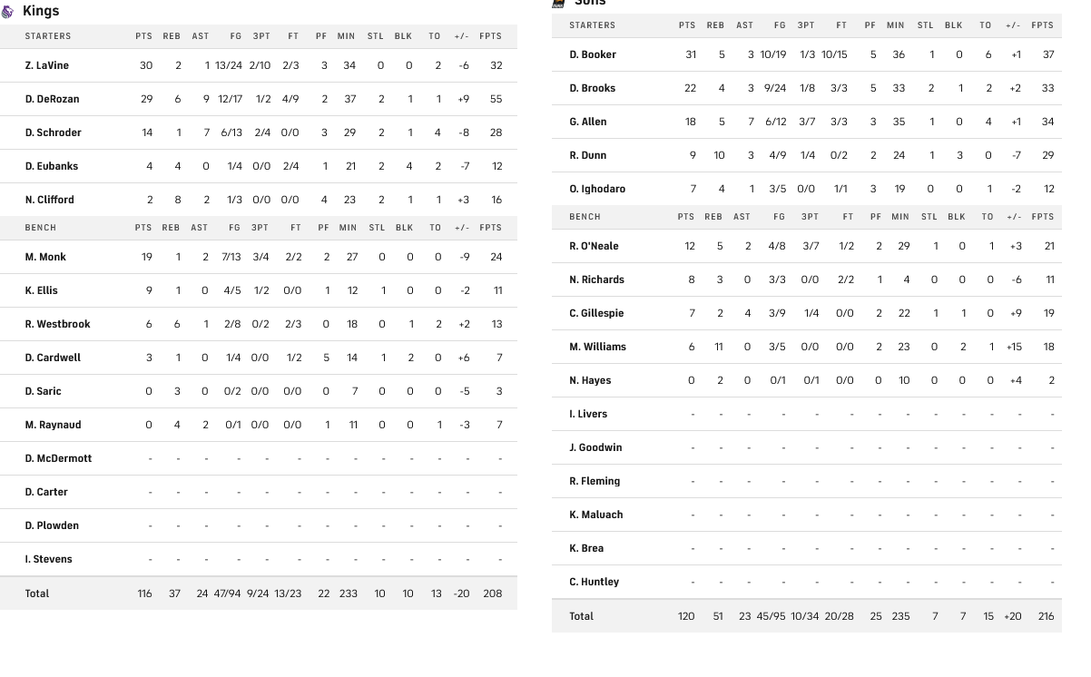 Τέλος, οι Σανς επικράτησαν με δυσκολία των Κινγκς, όπως δείχνει το τελικό 120-116. 31 πόντους πέτυχε ο Μπούκερ, ενώ για το Σακραμέντο, ο ΛαΒίν είχε 30 πόντους και ο ΝτεΡόζαν 29 πόντους, έξι ριμπάουντ και εννιά ασίστ.