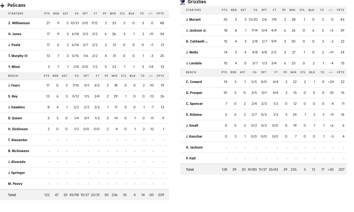 Με τον Μοράντ να σταματά στους 35 πόντους, οι Γκρίζλις λύγισαν με 128-122 τους Πέλικανς. Ο Τζάκσον ακολούθησε με 18 πόντους και οκτώ ριμπάουντ, ενώ για την Νέα Ορλεάνη, ο Ζάιον Γουίλιαμσον είχε 27 πόντους και εννέα ριμπάουντ.