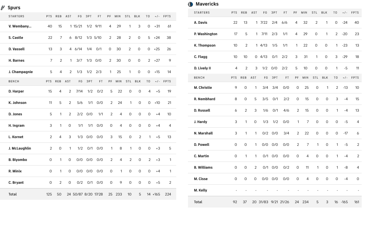 Εξαιρετική εμφάνιση από τον Γουεμπανιαμά, που τελείωσε το ματς με 40 πόντους και 15 ριμπάουντ, με τον Καστλ να έχει 22 πόντους, επτά ριμπάουντ και έξι ασίστ.