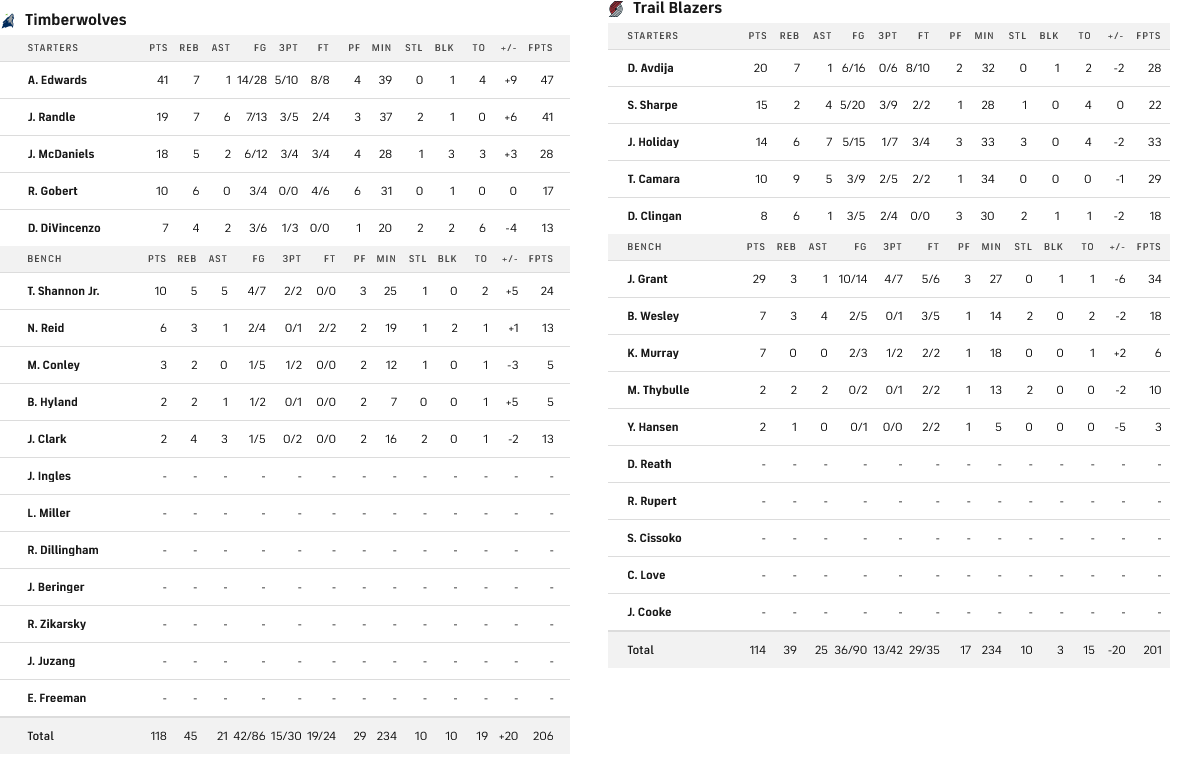 Ασταμάτητος Έντουαρντς με 41 πόντους, οδήγησε τους Τίμπεργουλβς στο νικηφόρο πέρασμα από το Πόρτλαντ με 118-114. Για τους γηπεδούχους, ο Γκραντ είχε 29 πόντους.
