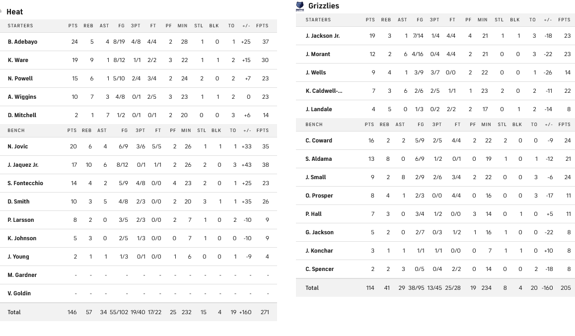 Οι Χιτς πέρασαν «αέρας» από τους Γκρίζλις με 116-146, έχοντας σε διψήφιο αριθμό πόντων 8 παίκτες. Πρωταγωνιστής των Μαιάμι ήταν ο Αντεμπάγιο με 24 πόντους, ενώ για τους Γκρίζλις διασώθηκε μόνο ο Τζάκσον με 19 πόντους.