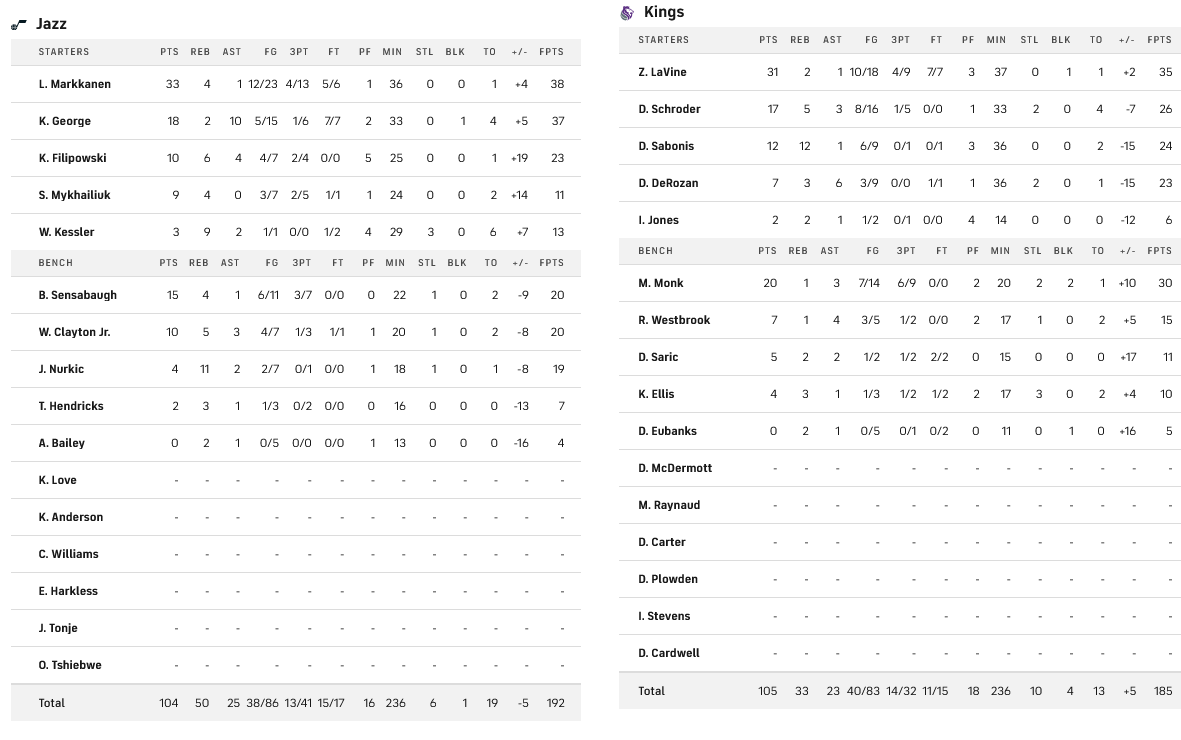 Οι Σακραμέντο Κινγκς πήραν το ματς-θρίλερ κόντρα στους Τζαζ με 105-104, με «μπροστάρη» τον Ζακ Λαβίν που πέτυχε 31 πόντους. Ο Μάρκανεν με 33 πόντους ήταν συγκινητικός για την ομάδα του αλλά δεν ήταν αρκετός για να δώσει την νίκη στους Τζαζ. Το τελευταίο καλάθι της αναμέτρης, πέτυχε ο Ντομάντας Σαμπόνις στα έξι δευτερόλεπτα πριν από την λήξη.