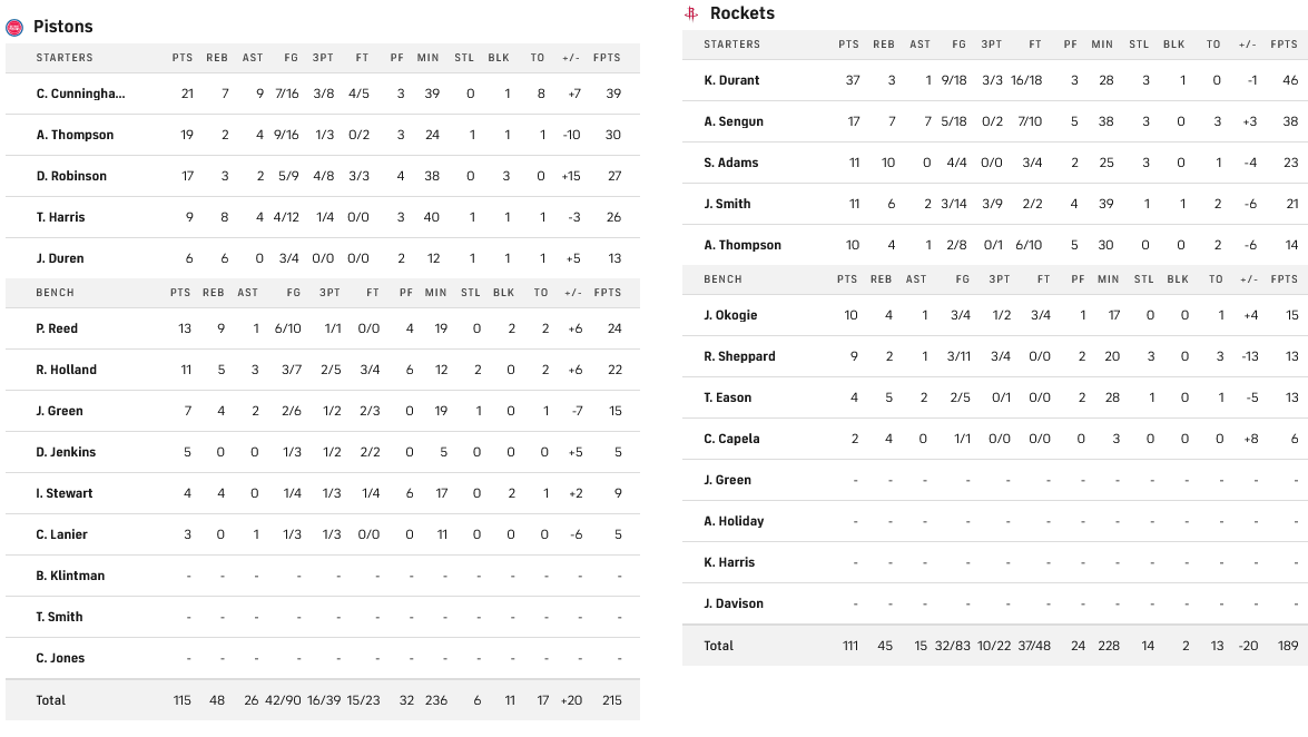 Οι Πίστονς έκαναν «διπλό» στο Χιούστον κόντρα στους Ρόκετς με 111-115, με τους Κάνινγχαμ (21 πόντους,7 ριμπάουντ, 9 ασίστ), Τόμπσον (19 πόντους) και Ρόμπινσον (17 πόντους) να χαρίζουν την νίκη στην ομάδα τους. Ο Ντουράντ «πάλεψε» μόνος του για τους Ρόκετς, σημειώνοντας 37 πόντους.
