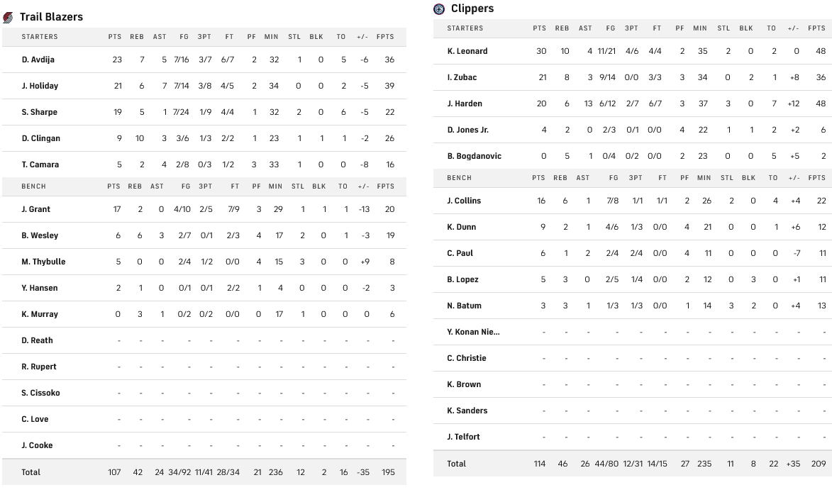 Νίκη και για τους Κλίπερς, που επιβλήθηκαν των Μπλέιζερς με 114-107. Στους 30 πόντους, τα 10 ριμπάουντ και τις τέσσερις ασίστ σταμάτησε ο Λέοναρντ, με τον Χάρντεν να έχει 20 πόντους και 13 ασίστ, ενώ εξαιρετικός ήταν και ο Ζούμπατς, με 21 πόντους και οκτώ ριμπάουντ.