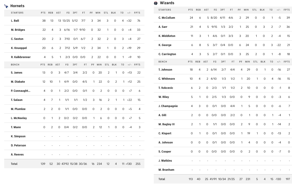 Επίδειξη δύναμης πραγματοποίησαν οι Χόρνετς, που διέλυσαν μέσα στην Γουάσινγκτον τους Γουίζανρτς με 139-113. Απολαυστικός ο «τριπλός» ΛαΜέλο Μπολ με 38 πόντους, 13 ριμπάουντ και ισάριθμες ασίστ