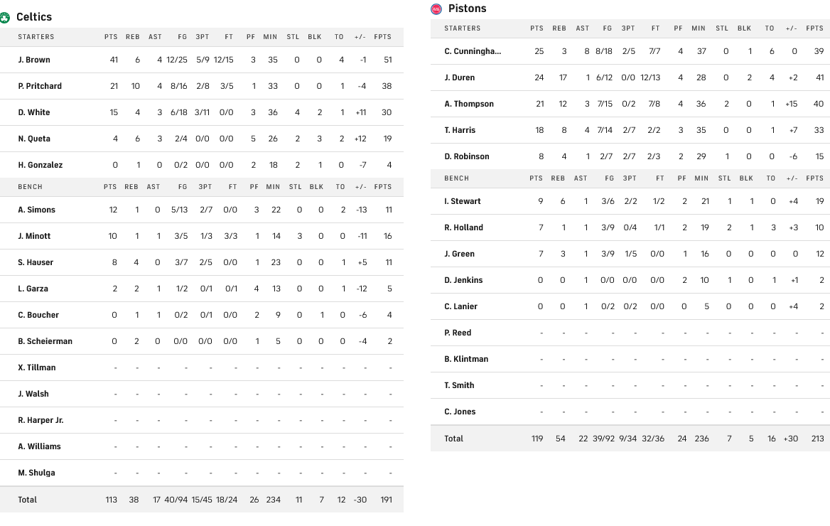Σπουδαία νίκη για τους Πίστονς, που λύγισαν με 119-113 τους Σέλτικς, έχοντας τον Κάνιγχαμ με 25 πόντους και οκτώ ασίστ, τον Ντούρεν με 24 πόντους και 18 ριμπάουντ και τον Τόμπσον με 21 πόντους και 12 ριμπάουντ.
