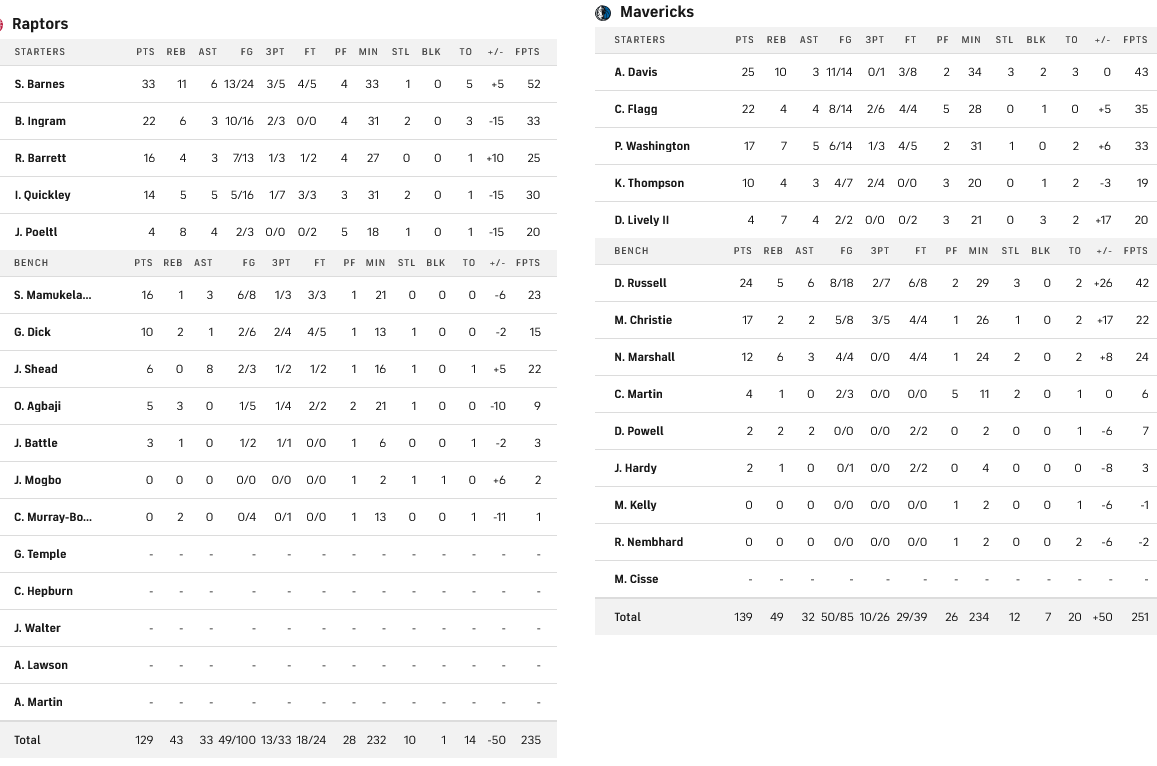 Ματσάρα είχαμε στο Ντάλας, με τους Μάβερικς να επικρατούν των Ράπτορς με 139-129. Double – double πέτυχε ο Ντέιβις με 25 πόντους και 10 ριμπάουντ, εξαιρετικός ο Φλαγκ με 22 πόντους, όπως και ο Ράσελ με 24. Για τους ηττημένους, ο Μπαρνς είχε 33 πόντους και 11 ριμπάουντ.