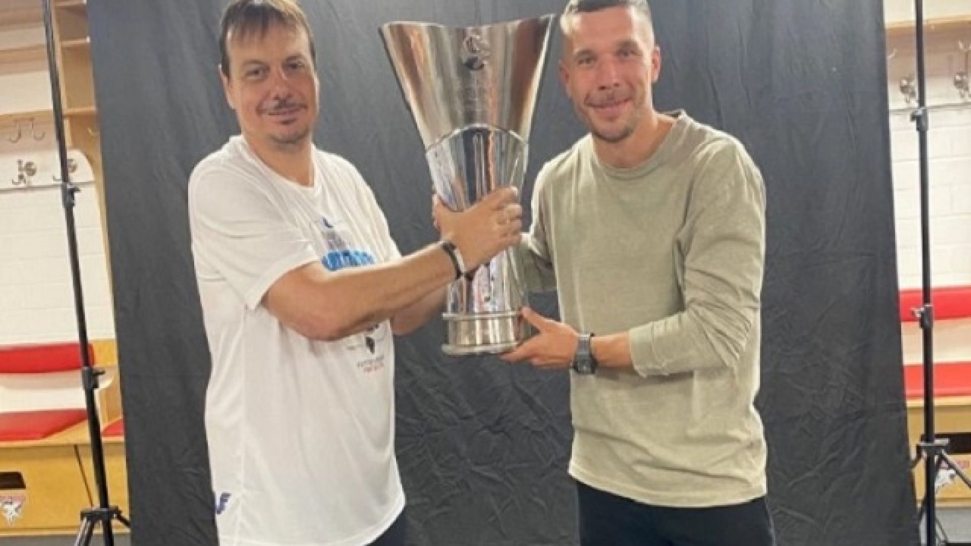 Ο Γερμανός παίκτης της Αντάλιασπορ, Λούκας Ποντόλσκι, συνεχάρη τον Εργκίν Αταμάν και πόζαρε μαζί του, κρατώντας το κύπελλο της Euroleague.