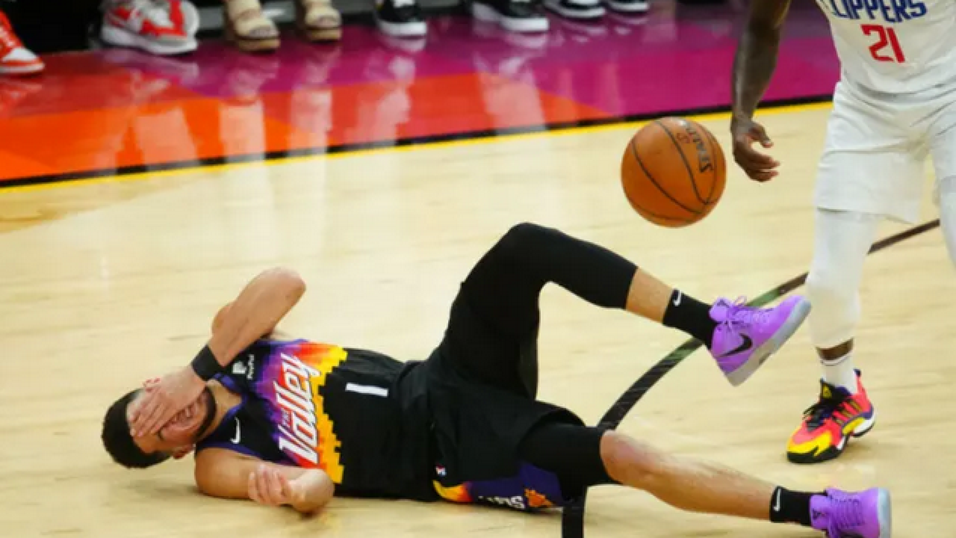 Συγκεκριμένα, η αναμέτρηση του Φοίνιξ βρισκόταν στην τρίτη της περίοδο με τον Μπούκερ να κινείται προς το καλάθι των Κλίπερς, να συγκρούεται με τον Πατ Μπέβερλι που τον μάρκαρε, με αποτέλεσμα να πέφτει αιμόφυρτος στο παρκέ, έχοντας σπάσει την μύτη του!