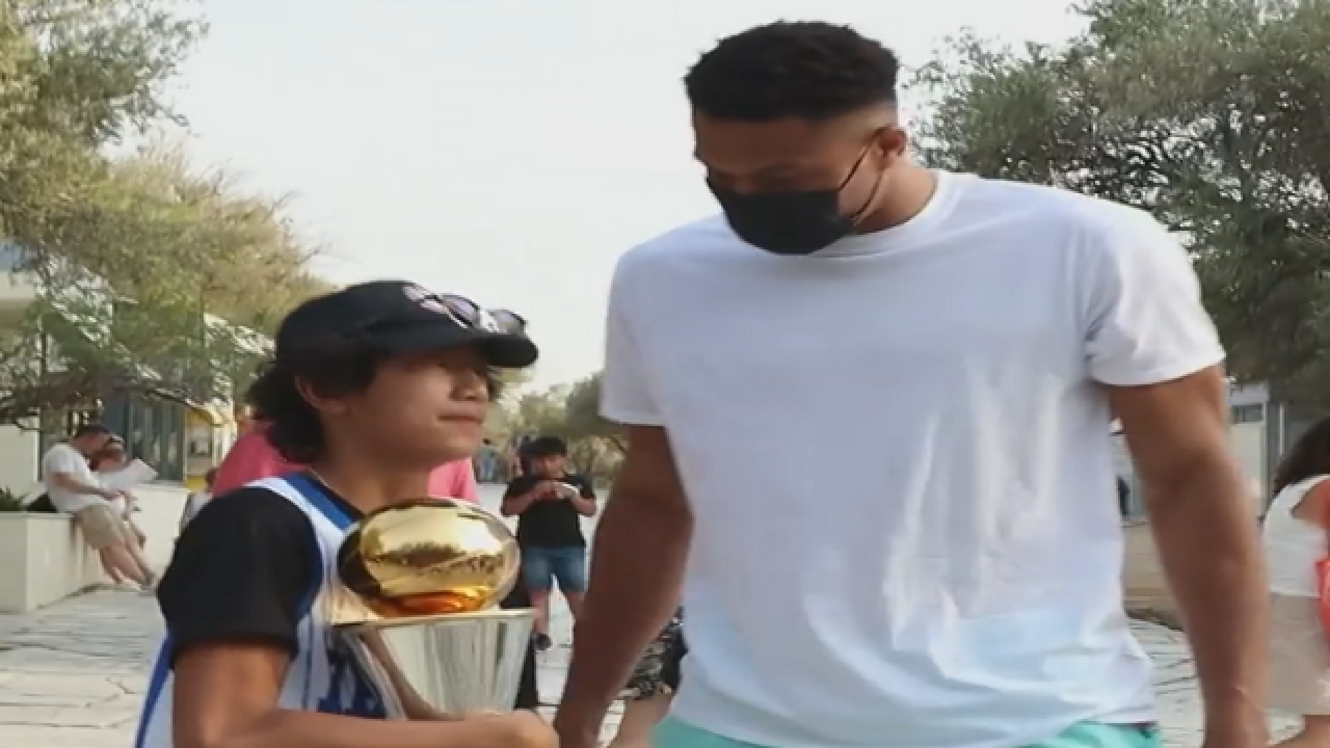 ο Γιάννης Αντετοκούνμπο εντόπισε έναν θαυμαστή του με φανέλα της Εθνικής Ελλάδας κατά της βόλτας του στην Ακρόπολη,  τον πλησίασε και του έδωσε το βραβείο του MVP των NBA Finals πριν φωτογραφηθεί κιόλας μαζί του.
