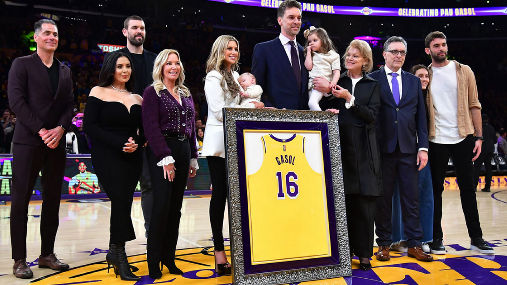 Ο Ισπανός σταρ είδε αρχικά το VIDEO των Λέικερς που ξεκινούσε με την Βανέσα Μπράιαντ να μιλάει και να τον ευχαριστεί, πριν στην συνέχεια δώσει τον λόγο σε μία παλιά δήλωση του Κόμπι για τον Γκασόλ, η οποία λύγισε τους πάντες. Στο πλευτό του ο κορυφαίος Ισπανός είχε την οικογένειά του, μεταξύ των οποίων και την 2χρονη κόρη του, Ελίζαμπετ Τζιάνα, στην οποία έδωσε το όνομα της κόρης του Κόμπι.
