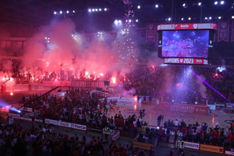 Ο Ολυμπιακός γιορτάζει την κατάκτηση του 14ου πρωταθλήματος στην ιστορία του, με τον τίτλο της σεζόν 2022-23 να βρίσκεται ήδη στον ουρανό του ΣΕΦ.