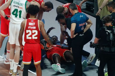 Άσχημα τα νέα για τους Πειραιώτες, που είδαν τον Γάλλο σέντερ να κτυπά στο πόδι και να αποχωρεί υποβασταζόμενος και κουτσαίνοντας για τα αποδυτήρια.