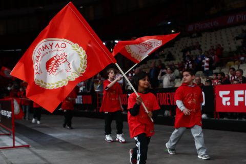 Πολύ όμορφη στιγμή στο ΣΕΦ, λίγο πριν την έναρξη του αγώνα ανάμεσα σε Ολυμπιακό και Κολοσσό Ρόδου, για την 20η αγωνιστική της GBL, με την Φιλαρμονική του Πειραιά να παίζει τον ύμνο των «ερυθρόλευκων», για τα 100α του γενέθλια.